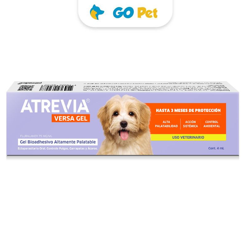►Atrevia® Versa Gel es un novedoso tratamiento antiparasitario sistémico versátil contra pulgas, garrapatas y ácaros, el primer gel del mundo en base a fluralaner. Empieza su acción en 90 minutos y mata a las pulgas en 8 horas y a las garrapatas en 12 horas. De hasta 3 meses de duración