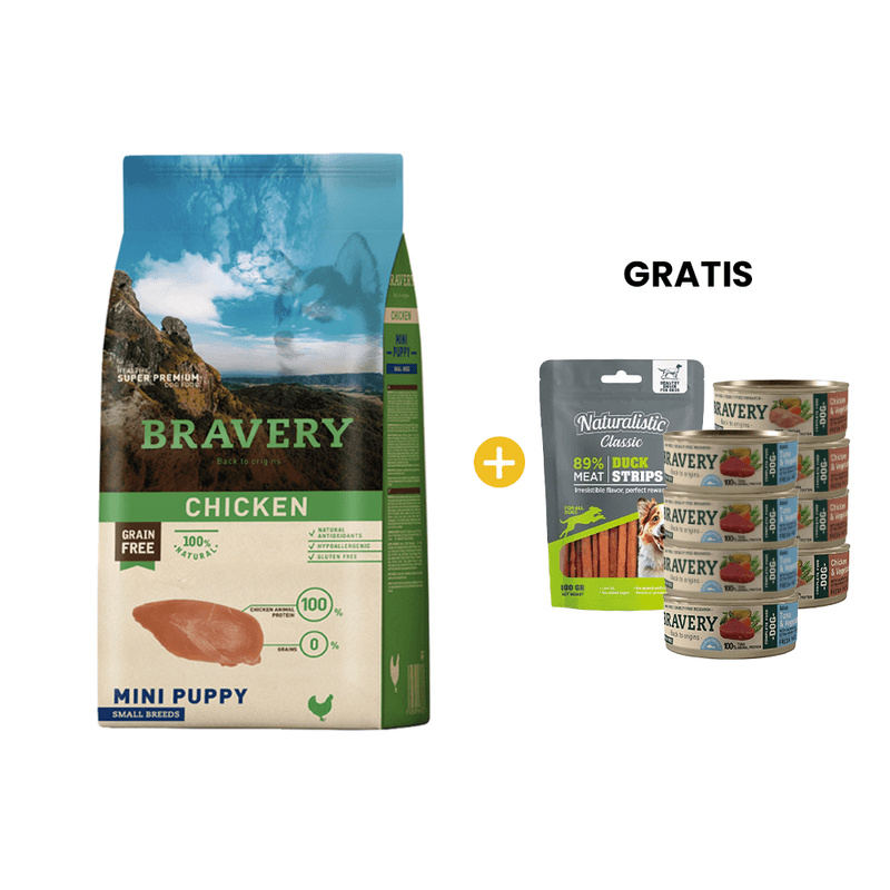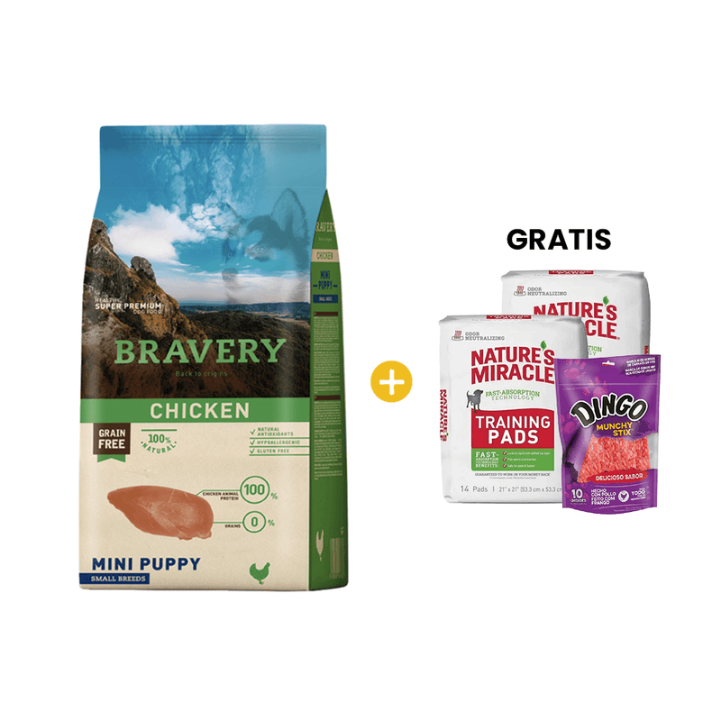Bravery Chicken Mini Puppy Small Breeds es un alimento para cachorros de razas pequeñas y/o miniatura. Libres de grano y cereales, los alimentos Bravery son mono proteicos, con carne siempre como primer ingrediente y enriquecidos con antioxidantes, hipo alergénicos y 100% naturales.