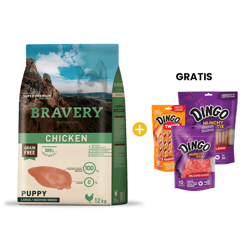 Bravery Chicken Puppy Large/Medium Breeds es un alimento para cachorros de razas medianas y grandes. Libres de grano y cereales, los alimentos Bravery sonmono proteicos, con carne siempre como primer ingrediente y enriquecidos con antioxidantes, hipo alergénicos y 100% naturales.