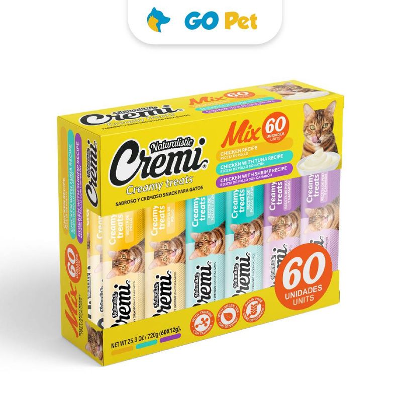 ►Caja de 60 Unidades(Tubitos de 12 Gr) con sabores variados en base a Pollo (Pollo, Pollo y Atún, Pollo y Camarón).