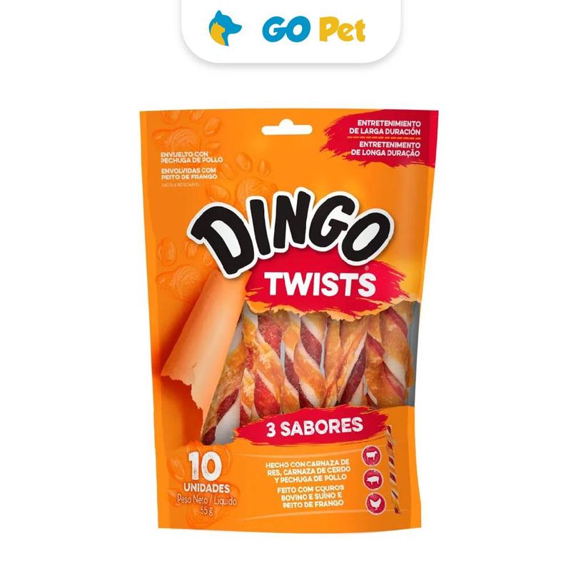 Un premio de larga duración hecho en forma de brochetas. Un premio en forma de palito envuelto con pechuga de pollo, carnaza de res y carnaza de cerdo.