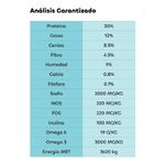 Proteína (30%), Grasa (12%), Ceniza (8.5%), Fibra (4.5%), Humedad (9%), Calcio (0.8%), Fósforo (0.7%), Sodio (2000 MG/KG), MOS (220 MG/KG), FOS (220 MG/KG), Inulina (100 MG/KG), Omega 6 (19 G/KG), Omega 3 (3000 MG/KG), Energía MET (3620 kg)