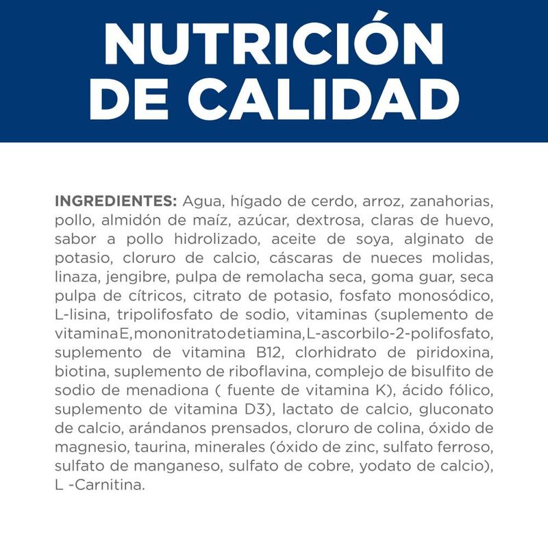Ingredientes | ►Agua, hígado de cerdo, arroz, zanahorias, pollo, almidón de maíz, azúcar, dextrosa, claras de huevo, saborizante de pollo hidrolizado, aceite de soya, alginato de potasio, cloruro de calcio, cáscaras de nuez molidas, linaza, jengibre, pulpa de remolacha desecada, goma guar, pulpa de cítricos desecada, citrato de potasio, fosfato monosódico, L-lisina, tripolifosfato de sodio, vitaminas (complemento de vitamina E, mononitrato de tiamina, L-ascorbil-2-polifosfato (fuente de vitamina C), complemento de niacina, pantotenato de calcio, complemento de vitamina B12, clorhidrato de piridoxina, biotina, complemento de riboflavina, complejo de bisulfito sódico de menadiona (fuente de vitamina K), ácido fólico, complemento de vitamina D3), lactato de calcio, gluconato de calcio, arándanos prensados, cloruro de colina, óxido de magnesio, taurina, minerales (óxido de zinc, sulfato ferroso, sulfato de manganeso, sulfato de cobre, yodato de calcio), L-carnitina. |