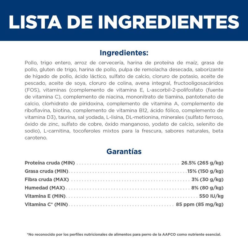 Ingredientes | ►Pollo, trigo entero, harina de gluten de maíz, grasa de pollo, arroz de cervecería, pulpa de remolacha desecada, saborizante de hígado de pollo, sulfato de calcio, ácido láctico, cloruro de potasio, aceite de pescado, cloruro de colina, L-lisina, vitaminas (complemento de vitamina E, L-ascorbil-2-polifosfato (fuente de vitamina C), complemento de niacina, mononitrato de tiamina, pantotenato de calcio, clorhidrato de piridoxina, complemento de riboflavina, complemento de vitamina A, biotina, complemento de vitamina B12, ácido fólico, complemento de vitamina D3), fosfato dicálcico, sal yodada, taurina, minerales (sulfato ferroso, óxido de zinc, sulfato de cobre, óxido manganoso, yodato de calcio, selenito de sodio), L-carnitina, DL-metionina, fibra de avena, tocoferoles mixtos para la frescura, sabores naturales, beta caroteno, manzanas, brócoli, zanahorias, arándanos, guisantes verdes. |