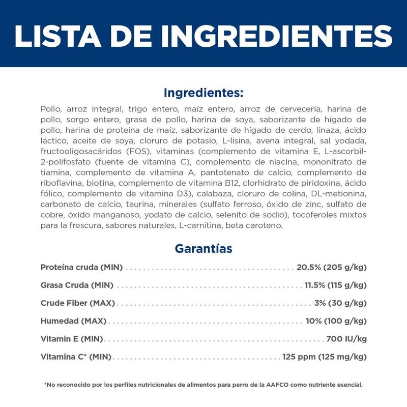 Ingredientes | ►Pollo, arroz integral, trigo entero, maíz entero, arroz de cervecería, harina de pollo, sorgo integral, grasa de pollo, harina de soya, saborizante de hígado de pollo, harina de gluten de maíz, saborizante de hígado de cerdo, linaza, ácido láctico, aceite de soya, cloruro de potasio, L-lisina, sal yodada, vitaminas (complemento de vitamina E, L-ascorbilo-2-polifosfato (fuente de vitamina C), complemento de niacina, mononitrato de tiamina, complemento de vitamina A, pantotenato de calcio, complemento de riboflavina, biotina, complemento de vitamina B12, clorhidrato de piridoxina, ácido fólico, scomplemento de vitamina D3), calabaza, Cloruro de colina, DL-metionina, carbonato de calcio, taurina, minerales (sulfato ferroso, óxido de zinc, sulfato de cobre, óxido manganoso, yodato de calcio, selenito de sodio), tocoferoles mixtos para la frescura, sabores naturales, L-carnitina, beta caroteno. |