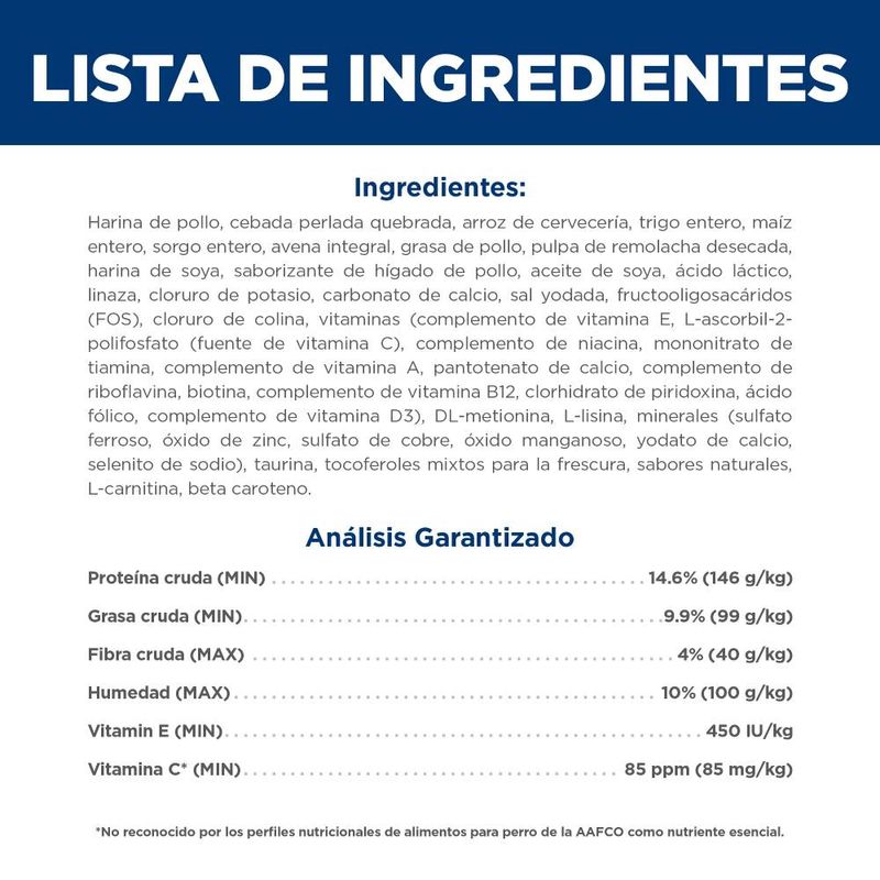 Ingredientes | ►Harina de pollo, cebada perlada quebrada, arroz de cervecería, trigo entero, maíz entero, sorgo entero, avena entera, grasa de pollo, pulpa de remolacha desecada, harina de soya, saborizante de hígado de pollo, aceite de soya, ácido láctico, linaza, cloruro de potasio, carbonato de calcio, sal yodada, cloruro de colina, vitaminas (complemento de vitamina E, L-ascorbil-2-polifosfato (fuente de vitamina C), complemento de niacina, mononitrato de tiamina, complemento de vitamina A, pantotenato de calcio, complemento de riboflavina, biotina, complemento de vitamina B12, clorhidrato de piridoxina, ácido fólico, complemento de vitamina D3), L-lisina, minerales (sulfato ferroso, óxido de zinc, sulfato de cobre, óxido manganoso, yodato de calcio, selenito de sodio), taurina, DL-metionina, fibra de avena, tocoferoles mixtos para la frescura, sabores naturales, L-carnitina, beta caroteno, manzanas, brócoli, zanahorias, arándanos, guisantes verdes. |