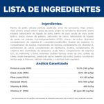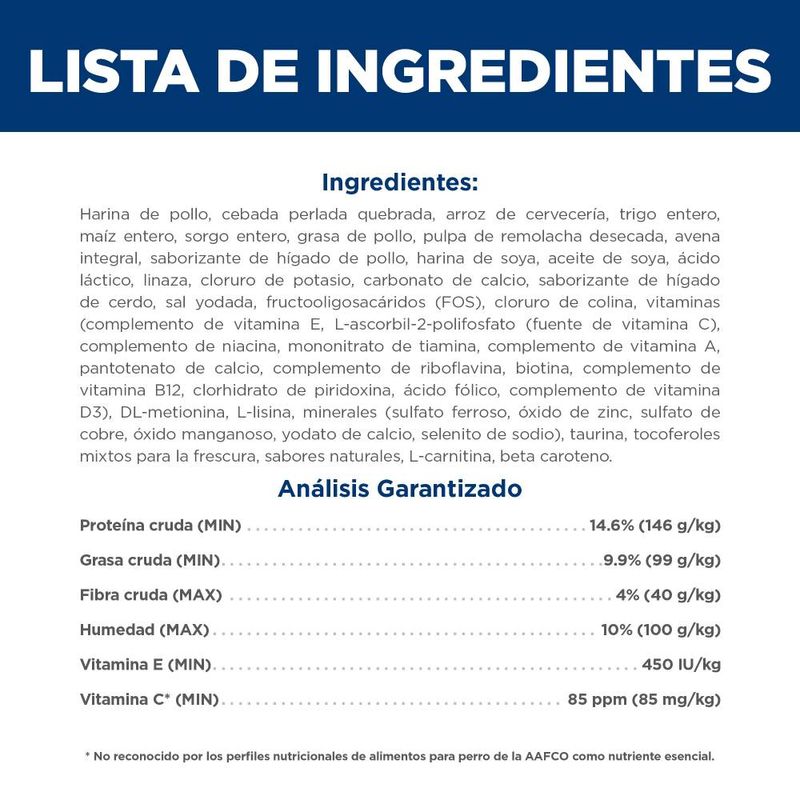 Ingredientes | ►Harina de pollo, cebada perlada quebrada, arroz de cervecería, trigo entero, maíz entero, sorgo entero, grasa de pollo, pulpa de remolacha desecada, avena entera, saborizante de hígado de pollo, harina de soya, aceite de soya, ácido láctico, saborizante de cerdo, linaza, cloruro de potasio, carbonato de calcio, sal yodada, cloruro de colina, vitaminas (complemento de vitamina E, L-ascorbil-2-polifosfato (fuente de vitamina C), complemento de niacina, mononitrato de tiamina, complemento de vitamina A, pantotenato de calcio, complemento de riboflavina, biotina, complemento de vitamina B12, clorhidrato de piridoxina, ácido fólico, complemento de vitamina D3), L-lisina, minerales (sulfato ferroso, óxido de zinc, sulfato de cobre, óxido manganoso, yodato de calcio, selenito de sodio), taurina, DL-metionina, fibra de avena, tocoferoles mixtos para la frescura, sabores naturales, L-carnitina, beta caroteno, manzanas, brócoli, zanahorias, arándanos, guisantes verdes. |