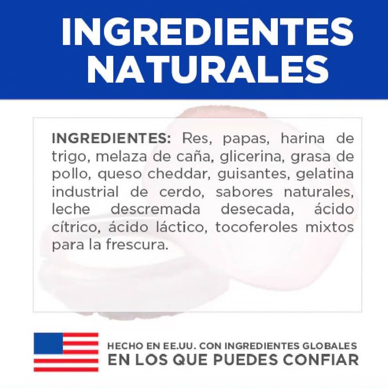 Ingredientes | ►Res, papas, harina de trigo, melaza de caña, glicerina, grasa de pollo, queso cheddar, guisantes, gelatina industrial de cerdo, sabores naturales, leche descremada desecada, ácido cítrico para la frescura, ácido láctico, tocoferoles mixtos para la frescura |