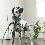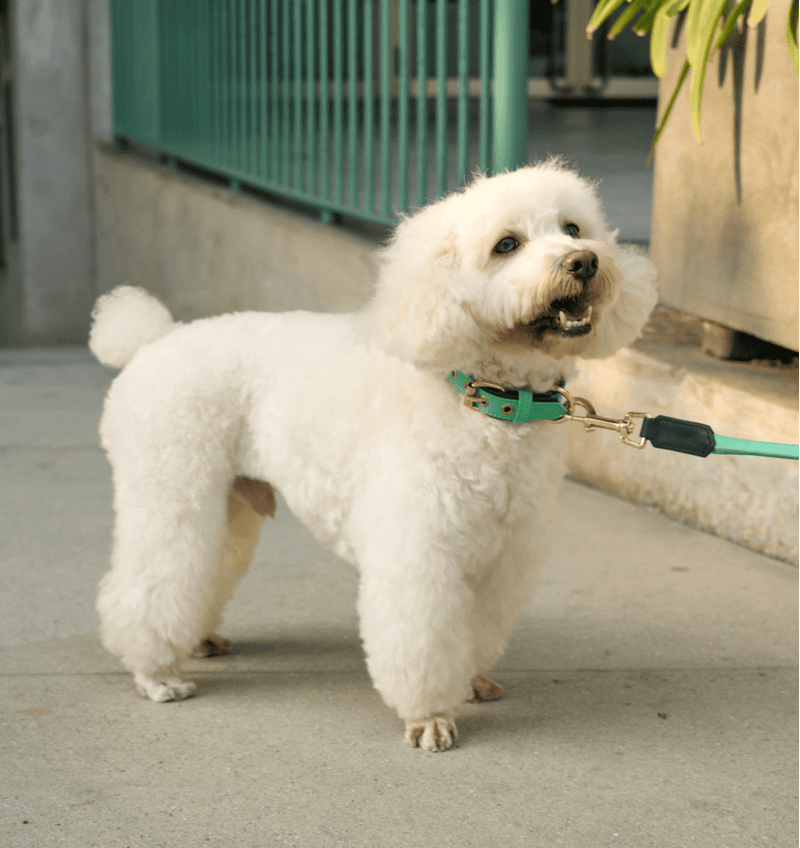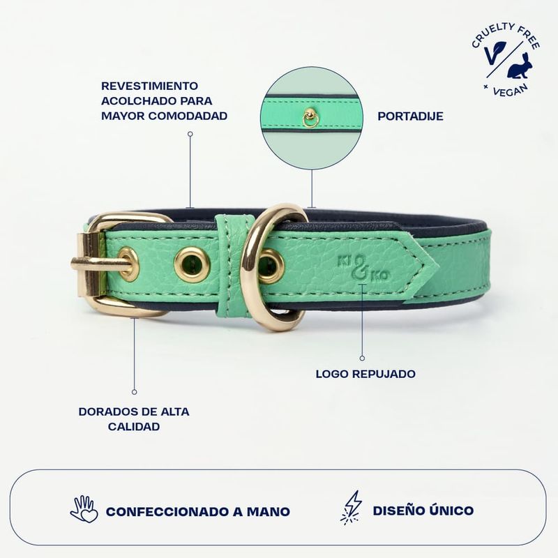 Collar ajustable de perros color verde agua con biselado azul y accesorios dorados de alta calidad.