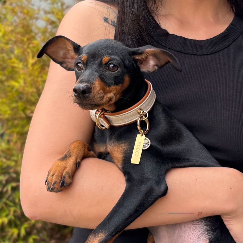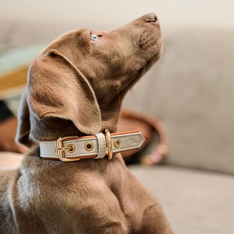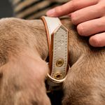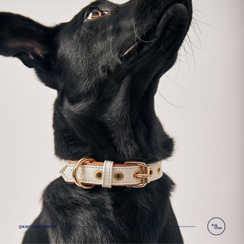 Collar ajustable de perros color nácar con biselado caramelo y accesorios dorados de alta calidad.