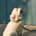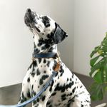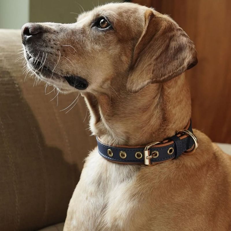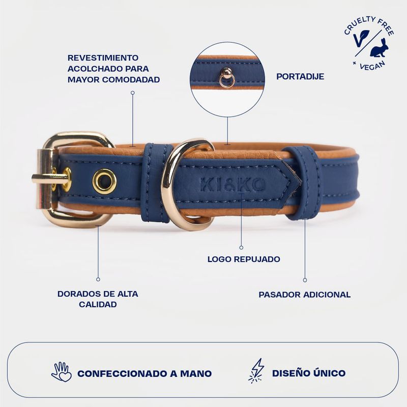Collar ajustable de perros color azul con biselado caramelo y accesorios dorados de alta calidad.
