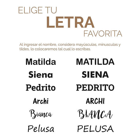 Puedes agregar la personalización con el nombre de tu mascota a uno de los lados y elegir la tipografía que más te guste.