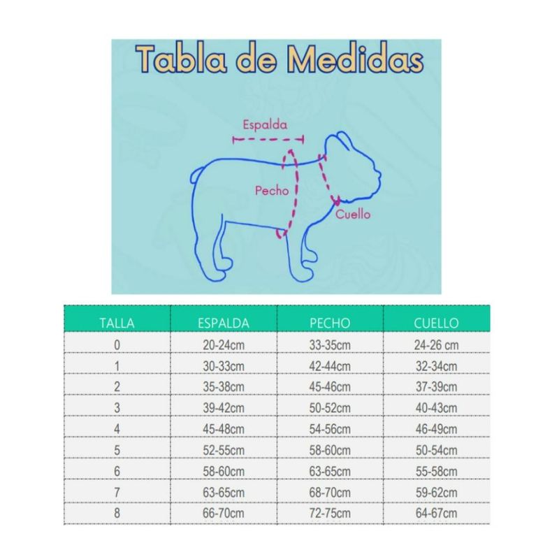 Recomendaciones: Mide a tu mascota siguiendo el ejemplo de la imagen y ubica sus medidas en los rangos de tallas.