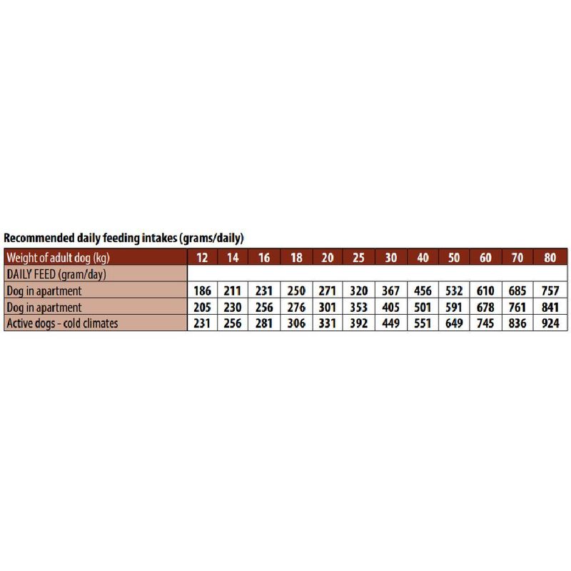 Guía de alimentación | La ración diaria recomendada (ver tabla) puede dividirse en dos comidas. Las necesidades nutricionales individuales pueden variar según el tamaño, la edad y el nivel de actividad del animal. Asegúrese de que siempre tenga agua limpia y fresca a su disposición. Si este producto sustituye a otro alimento o dieta, se recomienda introducirlo gradualmente durante al menos una semana. *Puede contener trazas de otras fuentes de proteínas. Alimento para mascotas, no apto para consumo humano. |