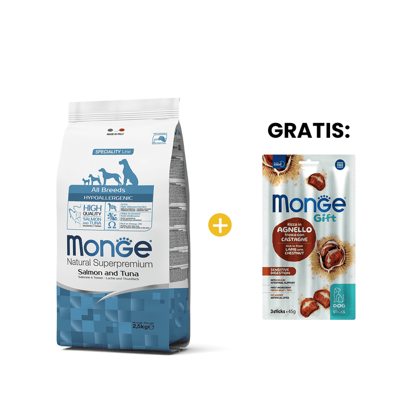 Nutrición especializada para perros con sensibilidades alimentariasMonge Adult Hipoalergénico Salmón y Atún es un alimento dietético completo diseñado para perros adultos de todas las razas que presentan intolerancias o sensibilidades digestivas. Su fórmula avanzada combina proteínas de alta calidad provenientes del salmón y el atún, junto con arroz como única fuente de carbohidratos, logrando una alimentación altamente digestible, segura y equilibrada.