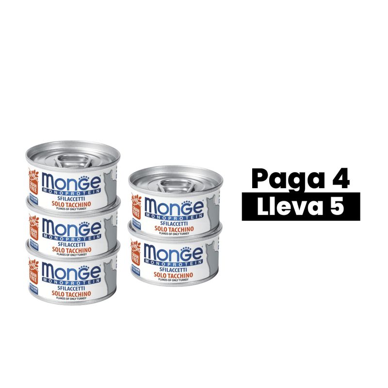 *Promoción 4+1 (Agrega 5 unidades y paga 4) - Promoción válida sobre el precio regular del producto.**Promoción válida para todas las variedades de Monge Feline Monoprotein Lata 80 Gr - se puede elegir entre todos los sabores disponibles(sale gratis el sabor con el precio más bajo).*Monge Feline Adult Monoprotein Pavo es un alimento completo para gatos adultos, hecho con una sola fuente de proteína animal: pavo, altamente digestible. Sus hojuelas cocidas al vapor tienen una textura suave y deliciosa. Contiene fibras que ayudan a controlar las bolas de pelo, menos grasa para mantener el peso ideal y minerales quelados para una óptima absorción de nutrientes. Además, incorpora la tecnología OptiRenal para apoyar la salud renal. Ideal para una nutrición balanceada y natural.
