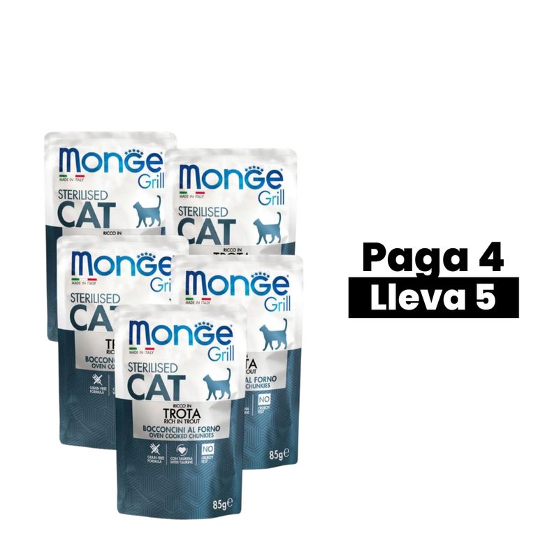 Monge Feline Grill Trucha ofrece trozos horneados en gelatina elaborados con trucha italiana, formulados sin cereales y diseñados especialmente para gatos esterilizados que necesitan control de peso y digestión ligera.