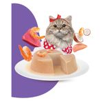 Ingredientes | Pollo, Atún, Hígado de res, Aminoácidos, Aceite de girasol, Taurina, Langostino, Taurina, Agentes gelificantes, Minerales, Vitaminas, Colorante, Aceite crudo de salmón, Aceite de coco, Prebióticos. |