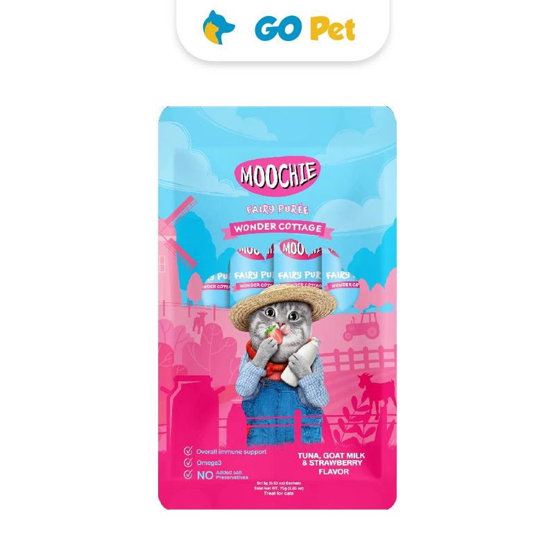 Moochie Tuna, Goat Milk & Strawberry 15 Gr x 5 Und - Snack para Gato Sabor Atún, Leche de Cabra y Fresa
