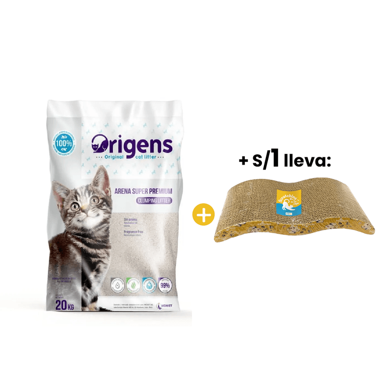 Arena sanitaria Origens Super Premium, hecha de perlas de bentonita con absorción 100% pura que garantiza una rápida aglomeración estable y compacta. Contiene una fórmula antibacteriana que neutraliza el mal olor, manteniendo el ambiente fresco y limpio.