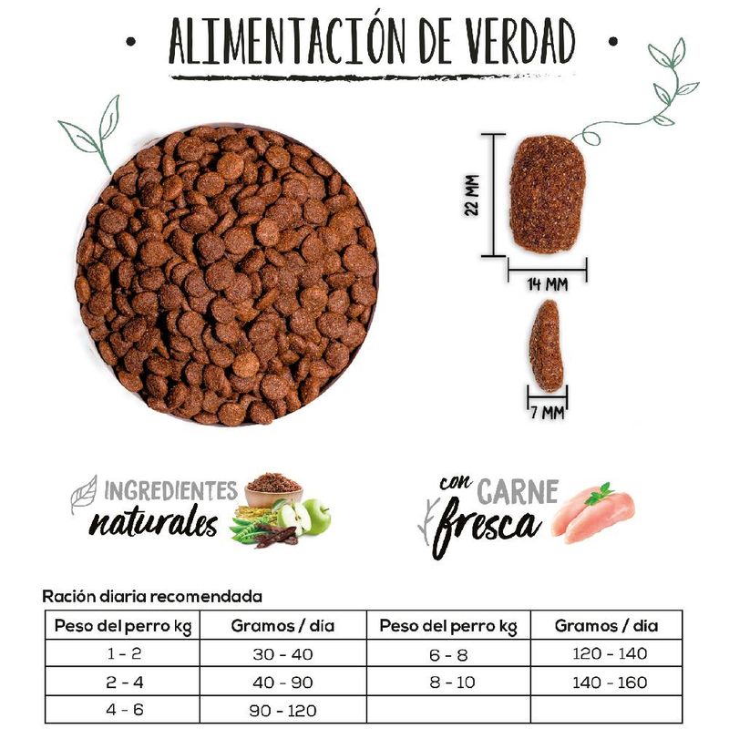 Ingredientes | Carnes 34% (carnes deshidratadas 24%, pollo fresco* 10% antes de la extrusión), trigo integral* (18%), grasa de pollo, maíz integral* (8%), cebada integral* (8%), salvado de trigo* (5%), arroz integral* (5%), guisantes enteros* (4%), algarroba* (2%), manzana* (1%), aceite de salmón, semilla de lino* (1%), pulpa de remolacha, fructo y manano oligosacáridos, levadura de cerveza* (0,5%), plantas aromáticas 0,02% (hinojo*, equinácea*, tomillo*), yucca schidigera. *Ingredientes naturales |