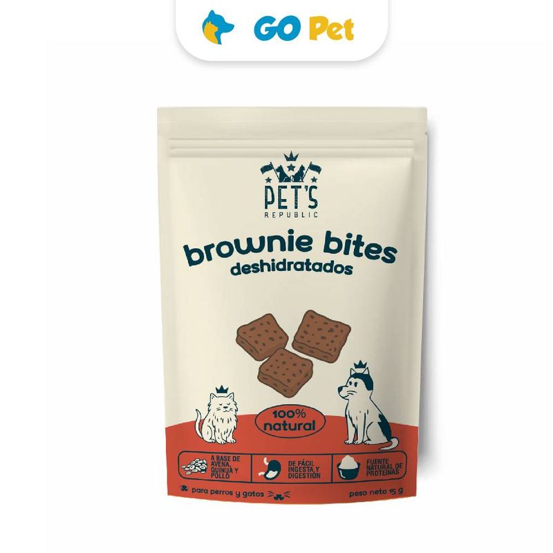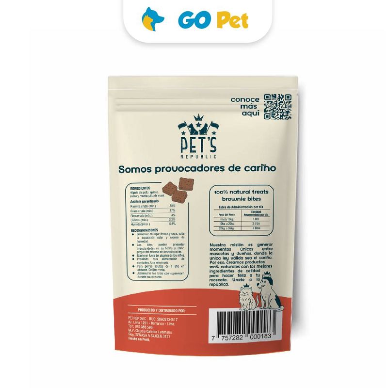 Los brownie bites de Pet's Republic están hechos de quinua, avena, hígado de pollo y mantequilla de maní 100% natural y sin preservantes. El formato -on the go- es perfecto para llevar adonde sea que vayas con tu mascota.