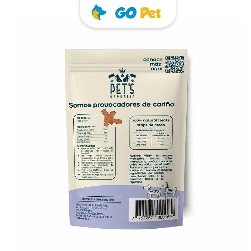 Los strips de cerdo de Pet's Republic son 100% naturalesy un gran fuente de colágeno. Además,tiene una función antiestrés que permite morder sin parar. El formato -On The Go- es perfecto para llevar adonde sea que vayas con tu mascota.
