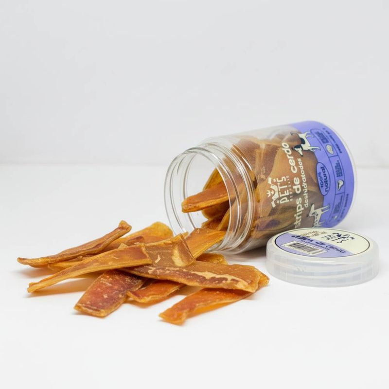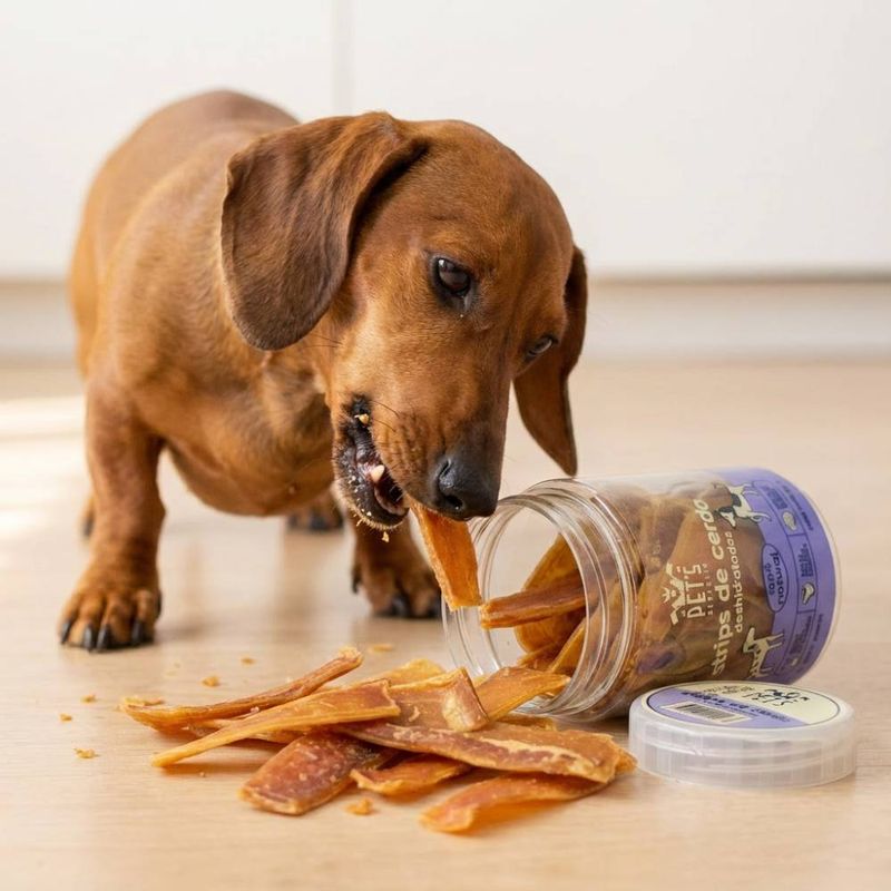 Treats de Cerdo 100% naturales y sin preservantes. Refuerza la mandíbula y articulaciones (colágeno), función antiestrés para los mas gruñones.