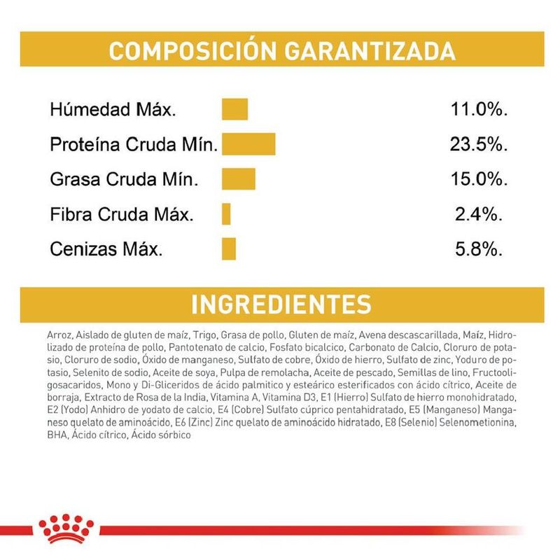 Ingredientes | -COMPOSICIÓN:arroz, aislado de proteínas vegetales*, trigo, grasas animales, gluten de maíz, avena descascarillada, maíz, hidrolizado de proteínas animales, minerales, aceite de soja, pulpa de remolacha, aceite de pescado, semillas de lino, fructo-oligosacáridos, mono- y diglicéridos de ácidos palmítico y esteárico esterificados con ácido cítrico, aceite de borraja, extracto de rosa de la India (fuente de luteína).
