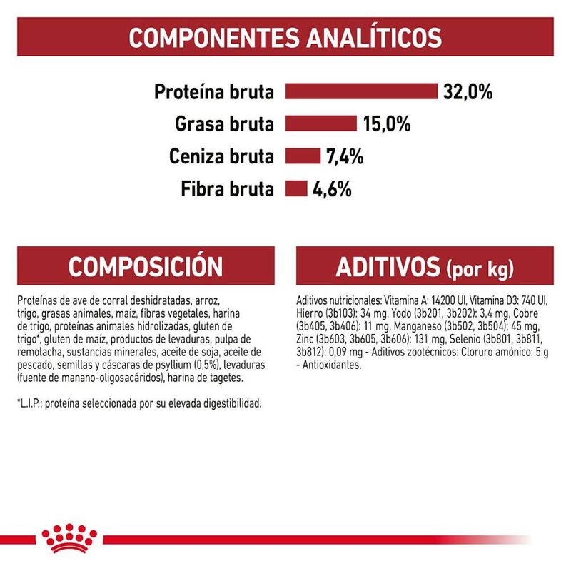 Ingredientes | Proteínas de aves deshidratadas, arroz, trigo, grasas animales, maíz, fibras vegetales, harina de trigo, proteínas animales hidrolizadas, gluten de trigo, gluten de maíz, productos de levadura, pulpa de remolacha, minerales, aceite de soja, aceite de pescado, cáscaras y semillas de psyllium (0,5 %), levaduras (fuente de manooligosacáridos), harina de caléndula. |