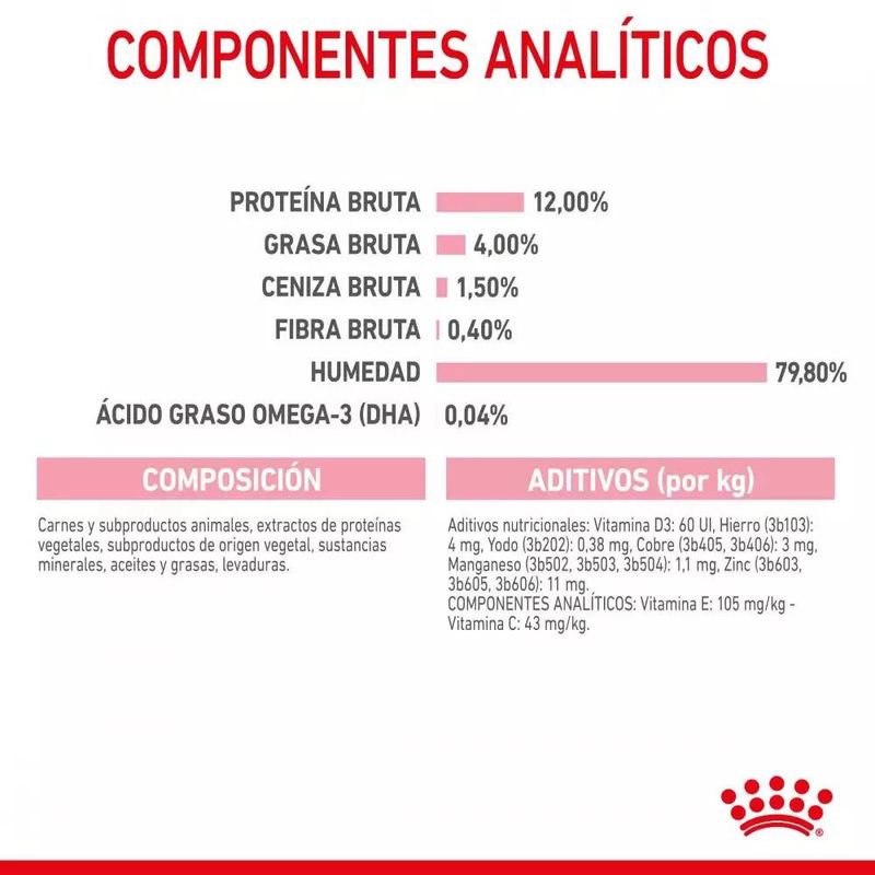 Información adicional | -COMPONENTES ANALÍTICOS: Proteína bruta: 12% - Grasa bruta: 4% - Ceniza bruta: 1,7% - Fibra bruta: 0,6% - Humedad: 79,5%.