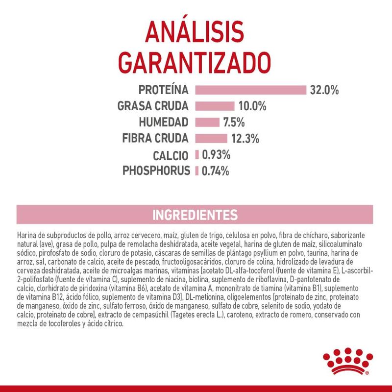 Ingredientes | Proteínas de ave deshidratadas, gluten de trigo, fibras vegetales, harina de trigo, grasas animales, proteínas animales hidrolizadas, harina de maíz, arroz, maíz, gluten de maíz, pulpa de remolacha, minerales, aceite de soja, productos de levadura, zeolita, vitaminas, cáscaras de psyllium y semillas, aceite de pescado, fructooligosacáridos, Llisina, levaduras (fuente de manooligosacáridos y betaglucanos), aceite de algas Schizochytrium sp (fuente de DHA), taurina, DL-metionina, antioxidantes (premezcla de tocoferoles, extracto de romero) , harina de tagetes, oligoelementos, Lcarnitina, betacaroteno, oligoelementos quelatos. |